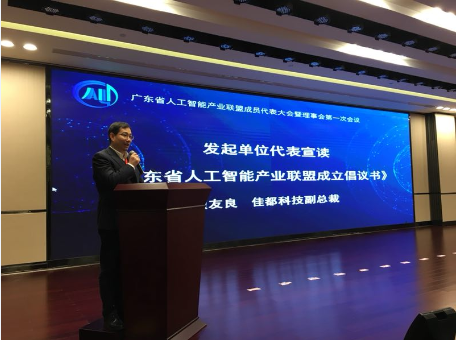 JDB电子科技副总裁顾友良作为发起单位代表宣读《广东省人工智能产业联盟成立倡仪书》